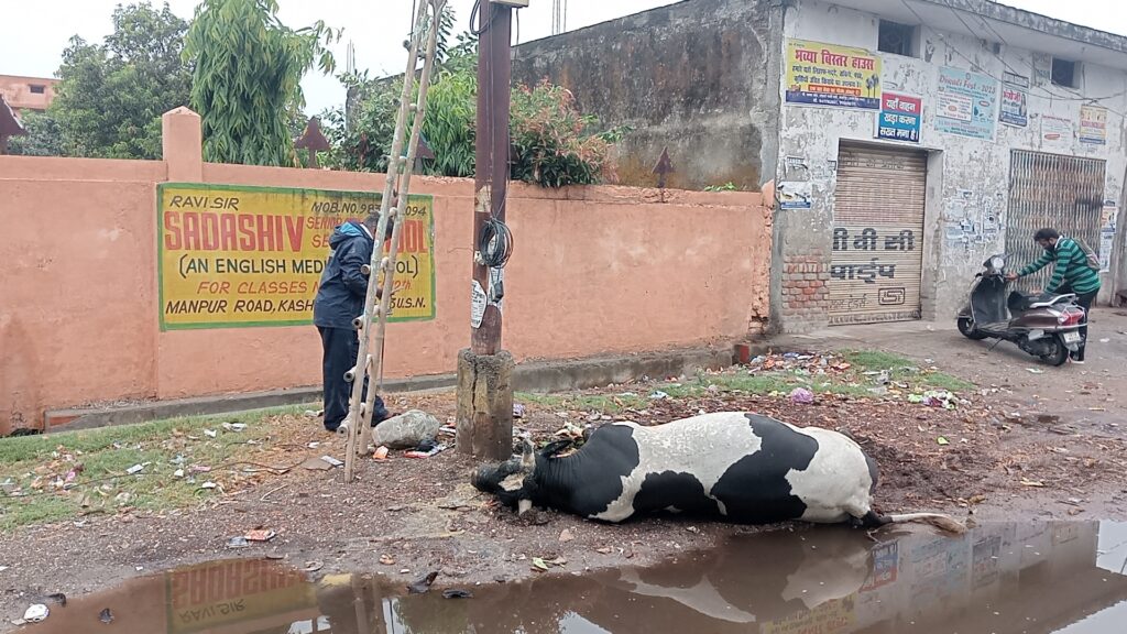 मानपुर रोड स्थित प्रेक्षागृह के गेट पर बिजली का खंबा लगा है। बारिश की वजह से खंबे में करंट आ रहा था। इसी बीच खंबे के आसपास पड़े कूड़े में अपने लिए भोजन की तलाश करते हुए सांड वहां पहुंचा। आसपास के लोगों ने बताया कि यहां खंबे के आसपास बिखरे कूड़े की वज़ह से आवारा घूम रहे पशु विचरते रहते हैं। यह सांड भी अक्सर वहां देखा जाता है। लेकिन आज खाने की तलाश ने एक निरीह जानवर को मौत के मुंह में धकेल दिया है।