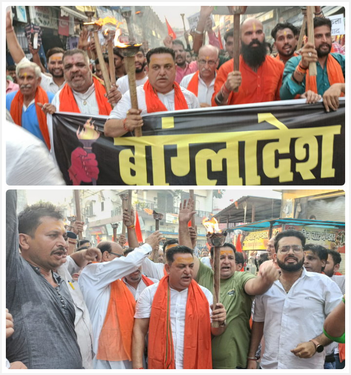 इस यात्रा में महिलाओं और पुरुषों के हाथों में जलती हुई मशालों के साथ-साथ नारे लिखी तख्तियां भी थी और यात्रा में चल रहे लोगों में इस बात को लेकर बेहद आक्रोश था कि बंग्लादेश में अल्पसंख्यक हिंदुओं पर घोर अत्याचार हो रहे हैं। उन अत्याचारों को तत्काल रोका जाए। आतंकवाद के विरुद्ध भी नारे लगाए गए और कहां गया कि अब सभी सनातनी आत्मरक्षा के साथ-साथ सनातन विरोधियों के विरुद्ध एकजुट हो जाए और शस्त्र रखना शुरू कर दे। भाजपा नेता दीपक बाली ने कहा कि आज की मशाल यात्रा महज एक दहाड है। अगर उसके बाद भी सनातन विरोधी नहीं सुधरते तो उन्हें किस ढंग से समझाया जाएगा यह देखा जाएगा। वरिष्ठ हिंदू नेता चिम्मनलाल छाबड़ा ने कहा कि अब सनातनी समाज को जाग कर एकजुट हो जाना चाहिए। हिंदू यात्रा महासंघ के राष्ट्रीय महासचिव केके अग्रवाल ने कहा कि अब समय आ गया है कि हमें अत्याचारों के विरुद्ध एकजुट होकर उठ खड़े होना होगा अन्यथा विरोधी सनातन समाज पर अत्याचार करते रहेंगे। युवा हिंदू सम्राट गगन कांबोज ने कहा कि अब हिंदू समाज जातियों के बंधन से बाहर निकाल कर खुद को केवल सनातनी मानते हुए एक जुट हो जाए तभी हम सनातन विरोधियों का मुकाबला कर सकते हैं ।उन्होंने चेतावनी दी कि विरोधी अब भी सुधर जाएं वरना उन्हें किस ढंग से समझाया जाता है यह सोचने पर सनातन समाज मजबूर हो जाएगा। पूर्व मेयर श्रीमती उषा चौधरी ने कहा कि विरोधी अब सनातन समाज को कमजोर न समझे और अपने अत्याचारों पर लगाम लगाए। मशाल यात्रा का नेतृत्व केके अग्रवाल चिमनलाल छाबड़ा श्रीमती उषा चौधरी वरिष्ठ भाजपा नेता दीपक बाली ,भाजपा के प्रदेश मंत्री गुरविंदर सिंह चंडोक, विश्व हिंदू परिषद के सुभाष चंद्र भारद्वाज ,गगन कांबोज ,विकास शर्मा खुट्टू ,केवल कृष्ण छाबड़ा संजय भाटिया, एडवोकेट सनत पैगिया मंजू यादव, सुधा शर्मा ,आदि ने किया जबकि मशाल यात्रा में श्याम अरोड़ा, अमित सक्सेना पवित्र शर्मा पंकज टंडन ,वरिष्ठ कांग्रेस नेता संदीप सहगल ,डॉ रमेश कश्यप ,अनिल शर्मा, अजय वीर यादव पूर्व पार्षद सर्वेश शर्मा, अनिल चौहान ,देव प्रजापति, सर्वेश बाली एसपी गुप्ता भाजपा नेता शिव अवतार गुप्ता नीरज गुप्ता, पवन कपूर सहित सैकड़ो सनातनी स्त्री पुरुषों ने भाग लिया।