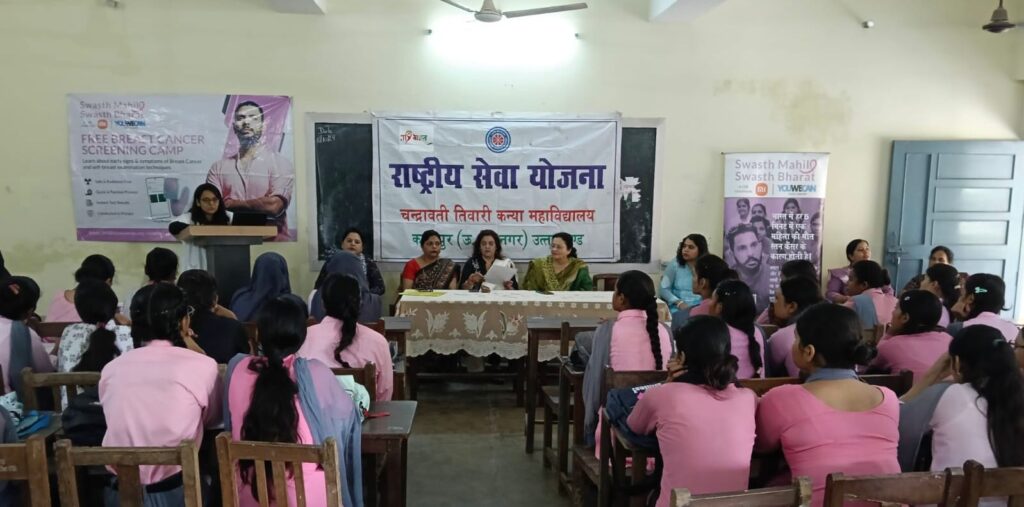 चन्द्रावती तिवारी कन्या स्नातकोत्तर महाविद्यालय क्रिकेटर युवराज सिंह फाउडेशन You We Can एन0सी0ओ0 एवं राष्ट्रीय सेवा योजना के तत्वाधान में “स्वस्थ महिला स्वस्थ भारत” के बैनर तले छात्राओं एवं प्राध्यापकों का निःशुल्क स्तन कैंसर स्क्रीनिंग शिविर का आयोजन किया गया। शिविर में विषय विशेषज्ञ डाॅ0 शगुन नारंग एवं डाॅ0 जुबी द्वारा कुल 40 छात्राओं एवं प्राध्यापकगणों का परीक्षण किया। परीक्षण से पूर्व डाॅ0 शगुन नारंग ने छात्राओं को स्तर कैंसर के प्रति जागरूक किया। उन्होंने स्तन कैंसर की अवस्थाओं एवं लक्षणों की जानकारी देते हुए स्वतः जाँच के टिप्स दिये। अन्त में महाविद्यालय प्राचार्या डाॅ0 कीर्ति पन्त ने विषय विशेषज्ञों का धन्यवाद किया।