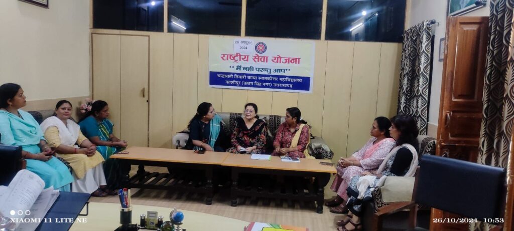काशीपुर। चन्द्रावती तिवारी कन्या स्नातकोत्तर महाविद्यालय में प्राचार्या डॉ0 कीर्ति पन्त जी की अध्यक्षता में राष्ट्रीय सेवा योजना कार्यक्रम ईकाई की समिति द्वारा 27 से 30 अक्टूवर 2024 तक दिवाली के उपलक्ष्य में स्थानीय बाजार क्षेत्रों में विशेष स्वच्छता अभियान, यातायात पुलिस की सहायता से यातायात प्रबंधन एव सेवा से सीखे- अस्पतालों में ई0एल0पी0 कार्यक्रमों के संदर्भ में बैठक का आयोजन किया गया एवं 28-10-2024 को स्थानीय बाजार सत्येन्द्र चन्दª गुडिया मार्ग पर विशेष स्वच्छता कार्यक्रम एवं एल0डी0 भट्ट राजकीय चिकित्सालय, काशीपुर में ई0एल0पी0 कार्यक्रम कराये जाने का निर्णय लिया गया। इस अवसर पर कार्यक्रम अधिकारी डॉ0 वन्दना सिंह, डॉ0 गीता मेहरा, असिस्टैण्ट प्रोफेसर डॉ0 अंजलि गोस्वामी, डॉ0 रजना, डॉ0 मंगला, डॉ0 पुष्पा धामा उपस्थित रहे।