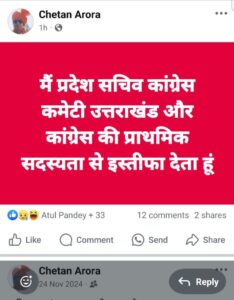 काशीपुर । उत्तराखंड कांग्रेस कमेटी के प्रदेश सचिव चेतन अरोरा ने दिया इस्तीफा।