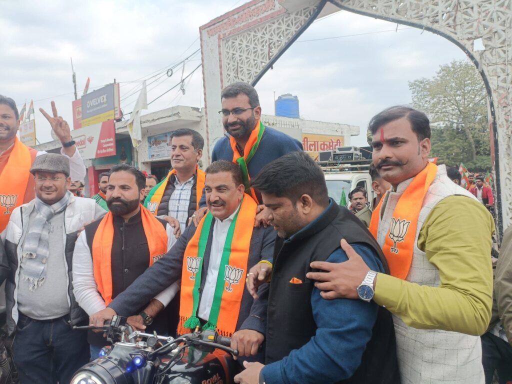 काशीपुर। राष्ट्रीय युवा दिवस एवं स्वामी विवेकानंद की जयंती के अवसर पर भारतीय जनता युवा मोर्चा द्वारा भाजपा मेयर प्रत्याशी दीपक बाली और पार्षद प्रत्याशियों के पक्ष में आज नगर में विशाल बाइक रैली निकाली गई जिसमें हजारों युवाओं ने बढ़-चढ़कर प्रतिभाग किया। इस दौरान वंदे मातरम्, जय श्री राम और चप्पा चप्पा भाजपा के गूंजते नारों से पूरा शहर भाजपा के रंग में रंगा नजर आया। वहीं दूसरी और दीपक वाली को आज अनिल डाबर एवं मनीष श्रीवास्तव के संस्थान पर सिक्कों से तोले जाने की तैयारी चल रही थी। यहां अनेक भाजपा पदाधिकारी एवं कार्यकर्ता मौजूद रहे। दीपक वाली ने कहा कि मुझे जो प्यार दिया है मैं उसे हमेशा याद रखूंगा।