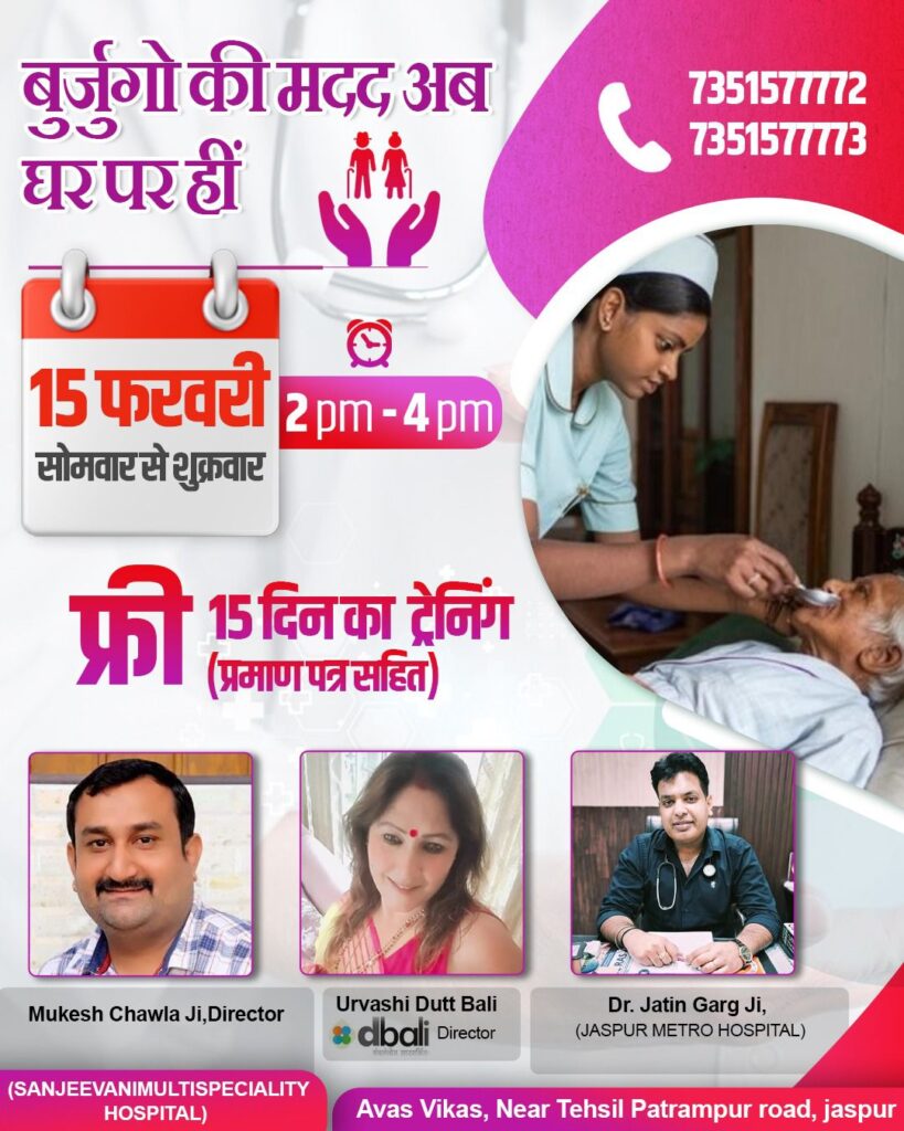 श्रीमती उर्वशी दत्त बाली ने बताया कि अनेक परिवार ऐसे हैं जहां संसाधन तो हैं मगर परिवार के स्त्री पुरुष अपने कारोबारी सिलसिले में सुबह ही घर से निकल जाते हैं और ऐसे में बड़े बुजुर्ग घरों में अकेले रह जाते हैं। वह अपनी प्राकृतिक क्रियाएं लघु शंका या दीर्घ शंका तक करने में असफल हैं और उन्हें न समय पर दवाई मिल पाती है तथा कई बार तो उठ न पाने के कारण उनके कपड़े और बिस्तर भी गंदगी से खराब हो जाते हैं और वे बेचारे बडा ही दर्दनाक दयनीय जीवन झेलते हैं। साथ ही अनेक बड़े बुजुर्ग ऐसे भी है जिनके बच्चे विदेश में नौकरी या कारोबार कर रहे हैं, वह चाह कर भी आ तो नहीं सकते मगर अपने बुजुर्गों की देखरेख और सेवा जरूर करना चाहते हैं। अपनों के अभाव में बड़े बुजुर्ग दयनीय जीवन जी रहे हैं। श्रीमती उर्वशी दत्त वाली ने बताया कि ऐसे बुजुर्गों की सेवा के लिए गार्जियन होम केयर सर्विस शुरू करने का उन्होंने मन बनाया है। उन्होंने जसपुर के मेट्रो हॉस्पिटल के डॉक्टर जतिन गर्ग तथा काशीपुर में मुरादाबाद रोड पर ढेला नदी के पास स्थित संजीवनी हॉस्पिटल के एम डी मुकेश चावला से भी इस बारे में बात की है कि जिन बच्चों या स्त्री पुरुषों को बुजुर्गों की सेवा में लगाया जाएगा उन्हें चिकित्सीय प्रशिक्षण दिया जाए। यह दोनों ही समाज सेवा के प्रति अपने यहां 15 दिन का निशुल्क प्रशिक्षण देने के लिए सहर्ष तैयार हो गए हैं। इनका कहना है कि इस प्रशिक्षण में अशिक्षित स्त्री और पुरुष भी भाग ले सकते हैं। प्रशिक्षण कार्य 15 फरवरी से शुरू हो जाएगा जो 15 दिन का होगा। प्रशिक्षण लेने वालों को एक प्रमाण पत्र भी जारी किया जाएगा जिसे दिखाकर वें कहीं भी नौकरी कर सकेंगे। इसके बाद पिछले 20 वर्ष से सिक्योरिटी सर्विस चला रहे वरिष्ठ भाजपा नेता चौधरी समरपाल सिंह ट्रेनिंग ले चुके स्त्री पुरुषों का उनके आधार कार्ड आदि से सत्यापन करेंगे कि वह चारित्रिक रूप से ठीक भी है या नहीं। कहीं ऐसा ना हो कि कोई गलत स्त्री पुरुष अकेले रह रहे बुजुर्गों की सेवा के नाम पर पहुंच जाए और कोई घटना दुर्घटना हो जाए। इस समस्या के निदान हेतु सिक्योरिटी सर्विस चला रहे चौधरी समरपाल सिंह ने भी समाज हित में अपनी निशुल्क सेवाएं देने का वचन दिया है। उर्वशी दत्त बाली ने बताया कि शीघ्र ही महिला व पुरुषों को निशुल्क चिकित्सीय प्रशिक्षण दिलाकर उन्हें बड़े बुजुर्गों की सेवा हेतु तैयार किया जाएगा, जिससे बड़े बुजुर्गों की सेवा भी हो जाएगी और बेरोजगार महिलाओं व पुरुषों को रोजगार भी मिल जाएगा।