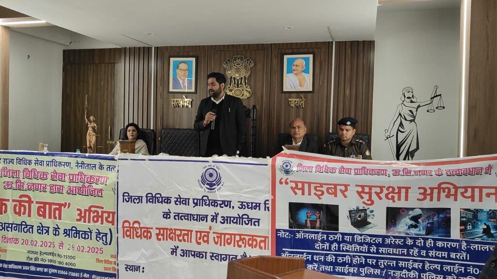 काशीपुर। राष्ट्रीय विधिक सेवा प्राधिकरण (नालसा) द्वारा पूरे भारत में विधिक जागरूकता कार्यक्रम का संचालन किया जा रहा है उसी परिप्रेक्ष्य में सत्येन्द्र चन्द्र गुड़िया लॉ कॉलेज में भी साइबर अपराध, यातायात नियमों, नशा उन्मुक्ति,असंगठित मजदूर के अधिकार, अल्पसंख्यकों के अधिकार एवं विधिक अधिकारों के प्रति जागरूकता कार्यक्रम का संचालन विधिक सेवा प्राधिकरण उधमसिंह नगर एवं तहसील विधिक सेवा प्राधिकरण काशीपुर के सहयोग से किया गया।