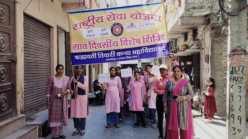 काशीपुर । चन्द्रावती तिवारी कन्या स्नातकोत्तर महाविद्यालय में राष्ट्रीय सेवा योजना के सात दिवसीय विशेष शिविर के चौथे दिन स्वंयसेवियों ने चयनित बस्ती तुफैल का बाग में “बेटी बचाओ बेटी पढ़ाओ” विषय पर जागरूकता रैली निकाली। स्वंयसेवियों ने “बेटी बचाओ देश बचाओ” और “बेटी पढ़ेगी तभी आगे बढ़ेगी” जैसे नारे लगाकर लोगों को बेटियों की शिक्षा और सुरक्षा के प्रति जागरूक किया। साथ ही कन्या भू्रण हत्या रोकने, लड़कियों की शिक्षा को बढ़ावा देने और लैंगिक समानता का सन्देश फैलाया।