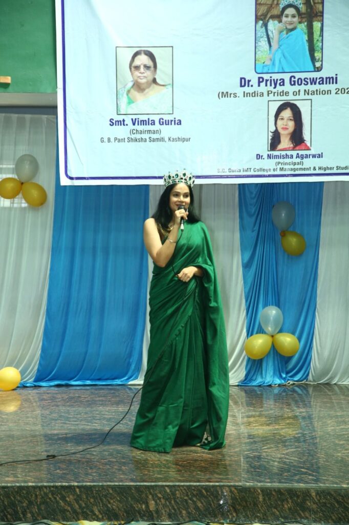 काशीपुर । बाजपुर रोड स्थित सत्येंद्र चन्द्र गुड़िया इंस्टिट्यूट ऑफ़ मैनेजमेंट एंड लॉ कॉलेज में मिसेज इंडिया प्राइड ऑफ नेशन डॉक्टर प्रिया गोस्वामी जी ने विद्यार्थियों को मोटिवेशनल व्याख्यान प्रस्तुत करते हुए उनके अंदर पर्सनेलिटी डेवलपमेंट को विकसित करने के लिए बहुत सारे विचार व्यक्त करते हुए सुझाव दिए। उक्त जानकारी देते हुए संस्थान की प्राचार्य डॉक्टर निमिषा अग्रवाल ने बताया कि इससे पूर्व मुख्य अतिथि डॉ प्रिया गोस्वामी, चंद्रावती तिवारी कन्या महाविद्यालय की उपप्राचार्य डॉक्टर दीपिका गुड़िया आत्रेय, उदय राज कॉलेज के उप प्रधानाचार्य मेजर मुनीश कांत शर्मा सहित अन्य अतिथियों ने मां सरस्वती एवं संस्थान के संस्थापक स्वर्गीय गुड़िया जी के चित्र के सम्मुख दीप प्रज्जलित एवं पुष्पांजलि अर्पित कर कार्यक्रम का शुभारंभ किया ।