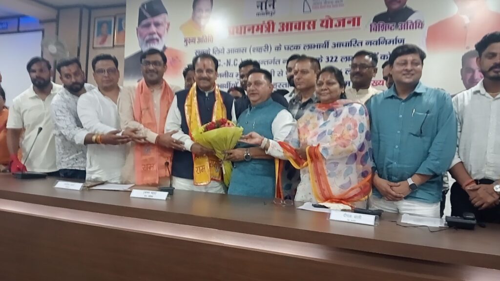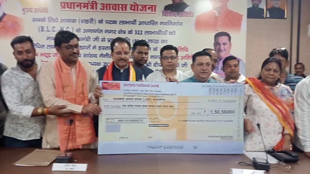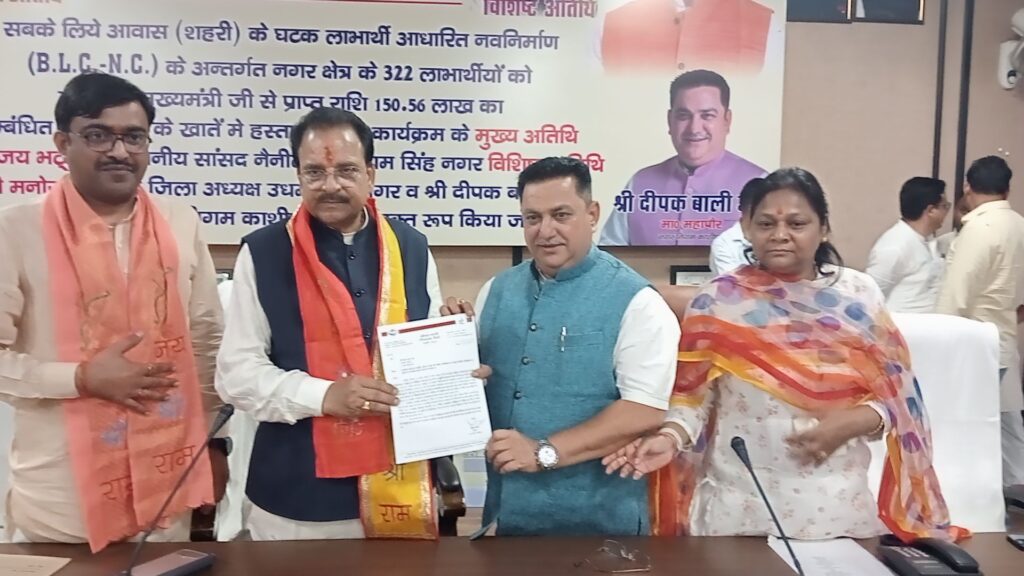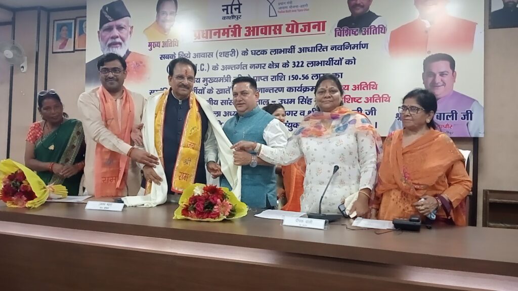 काशीपुर। आज यहां नगर निगम सभागार में आयोजित कार्यक्रम में मुख्य अतिथि सांसद अजय भट्ट और विशिष्ट अतिथि भाजपा के जिला अध्यक्ष मनोज पाल तथा महापौर दीपक बाली ने संयुक्त रूप से प्रधानमंत्री आवास योजना के तहत सबके लिए आवास( शहरी)योजना के 322 लाभार्थियों को नवनिर्माण के अंतर्गत माननीय मुख्यमंत्री जी से प्राप्त 1 करोड़ 50 लाख 56 हजार रु की धनराशि संबंधित लाभार्थियों के खाते में हस्तांतरित की गई। ऑनलाइन खातों में धन राशि आने से योजना के लाभआर्थियों के चेहरों पर अलग ही खुशी नजर आ रही थी और उन्होंने प्रधानमंत्री नरेंद्र मोदी और मुख्यमंत्री पुष्कर सिंह धामी का आभार जताया। लाभ पाने वालों में 98 लाभार्थियों को दूसरी 54को तीसरी 149 को चोथी और 21 को पांचवी किश्त मिली।
