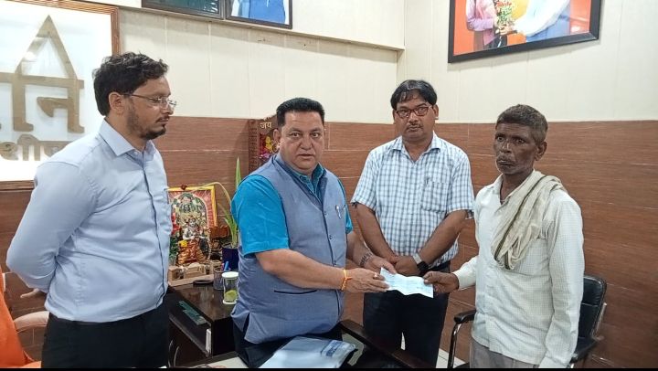 काशीपुर। मुरादाबाद रोड स्थित सूर्या रोशनी लिमिटेड में वृहस्पतिवार को हाइड्रोजन सिलेंडर फटने से हुए विस्फोट में जान गंवाने वाले सीतापुर (उत्तर प्रदेश) निवासी श्यामूसिंह यादव के परिजनों को सांत्वना स्वरूप सूर्या रोशनी लिमिटेड के एचआर हेड संजीव कुमार द्वारा दिया गया मुआवजा राशि का चेक नगर निगम महापौर दीपक बाली द्वारा निगम स्थित अपने कार्यालय में मृतक के पिता हरिसिंह को सौंपा गया।।