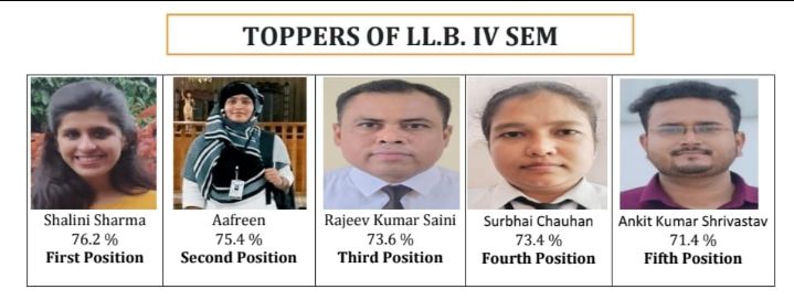 काशीपुर । सत्येन्द्र चन्द्र गुड़िया लॉ कॉलेज काशीपुर के एल एल.बी. चतुर्थ सेमेस्टर के छात्रों ने परीक्षा परिणामों में अपना परचम लहराते हुए स्वयं एवं संस्था का मान बढ़ाया है। लॉ कॉलेज के रजिस्ट्रार डॉ सुधीर कुमार दुबे ने यह बताया कि सत्येन्द्र चन्द्र गुड़िया लॉ कॉलेज के छात्रों ने एल एल. बी. चतुर्थ सेमेस्टर की परीक्षा में उत्कृष्ट प्रदर्शन किया है और शत प्रतिशत विद्यार्थी उत्तीर्ण हुए हैं, जिसमें कि 90 प्रतिशत छात्र एवं छात्राएं प्रथम श्रेणी से उत्तीर्ण हुए हैं। डॉ दुबे ने बताया कि 76.20 प्रतिशत अंकों के साथ शालिनी शर्मा सुपुत्री लक्ष्मी कांत शर्मा ने प्रथम स्थान प्राप्त किया है, जबकि 75.40 प्रतिशत अंक प्राप्त करके आफरीन सुपुत्री मौ. अनीस ने द्वितीय स्थान प्राप्त किया, राजीव कुमार सैनी सुपुत्र राम भरोसे लाल सैनी 73.60 प्रतिशत अंको के साथ तृतीय स्थान पर रहे वहीं सुरभी सुपुत्री तीरथ सिंह चौहान ने 73.40 फीसदी अंक प्राप्त कर चतुर्थ स्थान पर रहीं और अंकित कुमार श्रीवास्तव 71.40 फीसदी अंक प्राप्त कर पांचवें स्थान पर रहे। कुमाऊं विश्वविद्यालय में सत्येंद्र चन्द्र गुड़िया लॉ कॉलेज के छात्र निरंतर पदक प्राप्त करते आ रहे हैं, उसी ऊंची उड़ान को आगे बढ़ाते हुए चतुर्थ सेमेस्टर के छात्रों ने भी अपना उच्च कोटि का प्रदर्शन जारी रखा है।