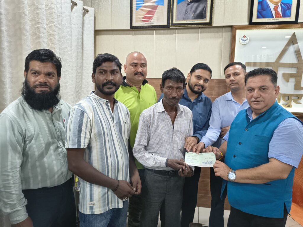 काशीपुर। कोविड महामारी के दौरान ड्यूटी पर मुस्तैद रहते हुए शहीद हुई सफाई कर्मचारी श्रीमती उषा के पति को मुख्यमंत्री राहत कोष से मिले 10 लाख रुपए के चेक को आज महापौर दीपक बाली ने मृतका के पति को भेंट किया और दिवंगत उषा को श्रद्धांजलि देते हुए प्रभु से प्रार्थना की गई कि वह उसे अपने चरणों में स्थान दें।