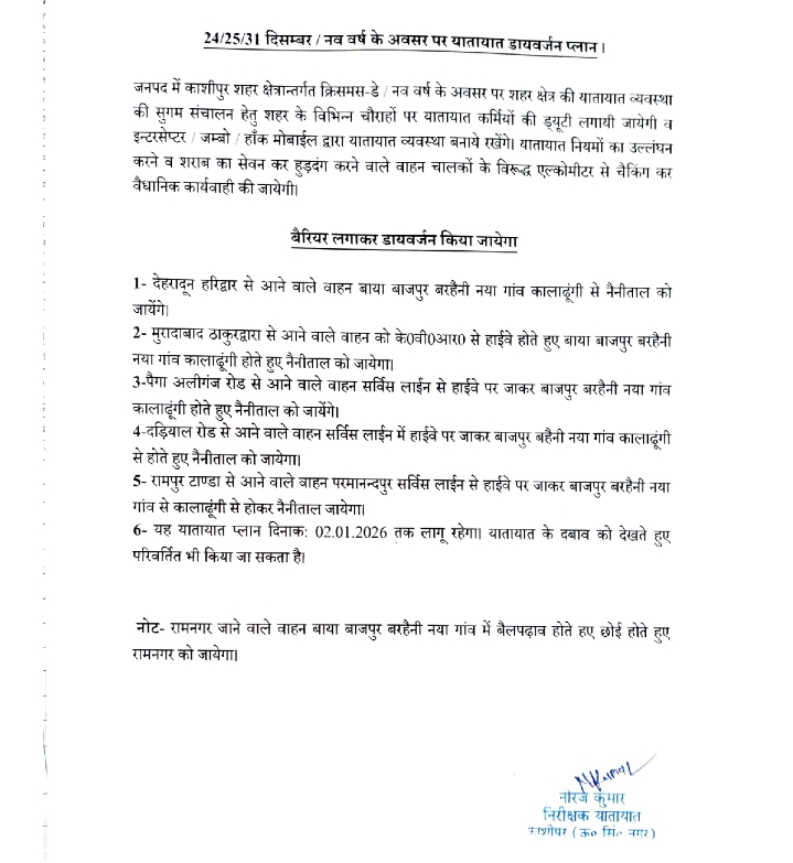 काशीपुर। क्रिसमस-डे एवं नववर्ष के अवसर पर शहर में बढ़ने वाली यातायात भीड़ को देखते हुए पुलिस प्रशासन ने विशेष ट्रैफिक डायवर्जन प्लान लागू किया है। यह व्यवस्था 24, 25 और 31 दिसंबर के साथ-साथ नववर्ष के दिन भी प्रभावी रहेगी। प्रशासन का उद्देश्य त्योहारों के दौरान शहर में यातायात को सुचारू बनाए रखना और किसी भी प्रकार की अव्यवस्था से बचना है।