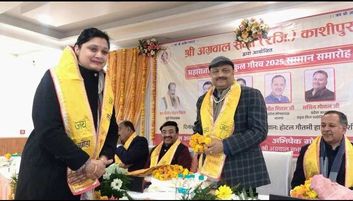 काशीपुर। श्री अग्रवाल सभा काशीपुर द्वारा बाजपुर रोड स्थित एक होटल में ‘महाराजा अग्रसैन कुल गौरव 2025 सम्मान समारोह’ का भव्य आयोजन किया गया, जिसमें वैश्य समाज के विभिन्न क्षेत्रों में उत्कृष्ट कार्य करने वाले प्रतिनिधियों को सम्मानित किया गया। समारोह में राजनीति, उद्योग, व्यापार और सामाजिक क्षेत्र से जुड़ी कई विशिष्ट हस्तियों की गरिमामयी मौजूदगी रही।