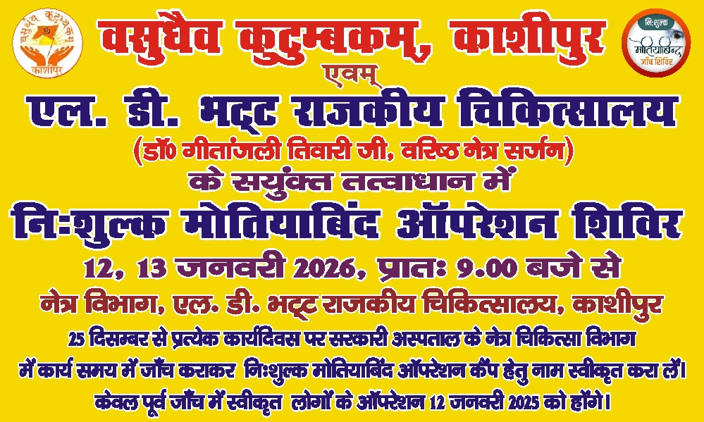 काशीपुर (उत्तराखंड)।समाज सेवा के क्षेत्र में अग्रणी संस्था वसुधैव कुटुम्बकम् द्वारा अपनी सामाजिक जिम्मेदारी का निर्वहन करते हुए आगामी 12 एवं 13 जनवरी 2026 को काशीपुर में एक विशाल निशुल्क मोतियाबिंद जाँच एवं ऑपरेशन शिविर का आयोजन किया जा रहा है। यह शिविर एल.डी. भट्ट राजकीय चिकित्सालय, काशीपुर में आयोजित होगा।