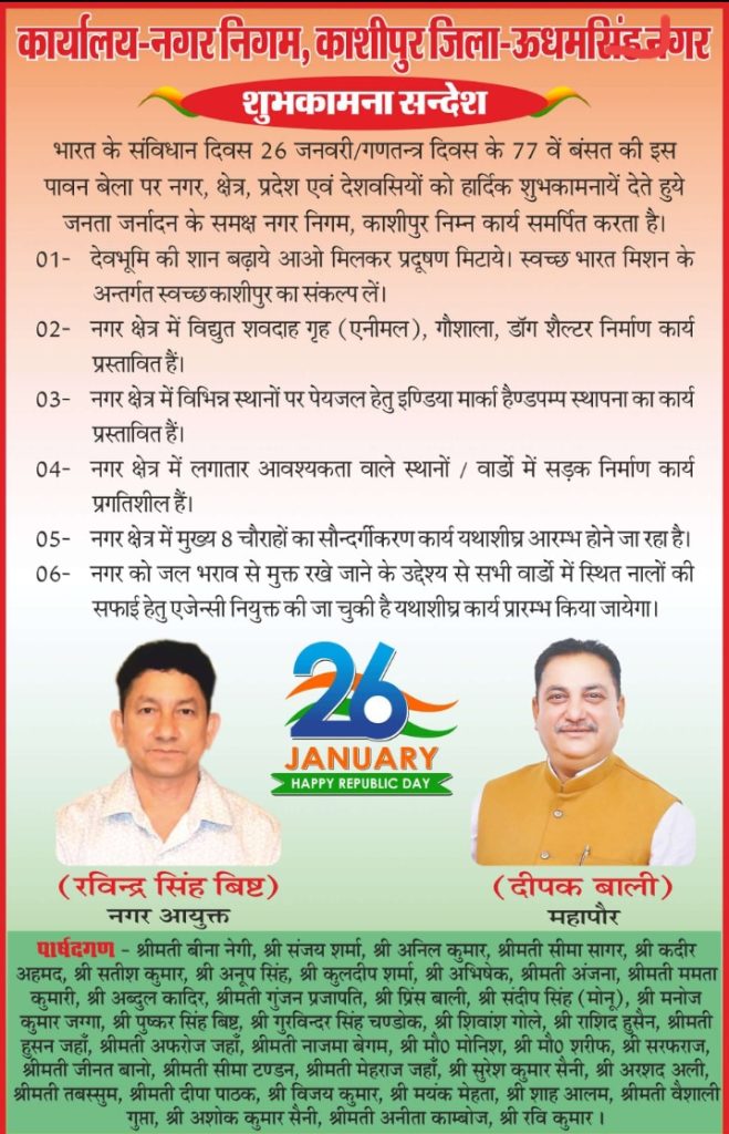 काशीपुर।77वें गणतंत्र दिवस के अवसर पर स्थानीय मोहल्ला काजीबाग स्थित झंडा चौक पर महानगर कांग्रेस कमेटी के तत्वावधान में ध्वजारोहण कार्यक्रम आयोजित किया गया। कार्यक्रम में महानगर कांग्रेस कमेटी की अध्यक्ष अलका पाल ने कांग्रेसी कार्यकर्ताओं के साथ राष्ट्रीय ध्वज फहराया और देश की एकता, अखंडता व संविधान के प्रति निष्ठा की शपथ दिलाई।