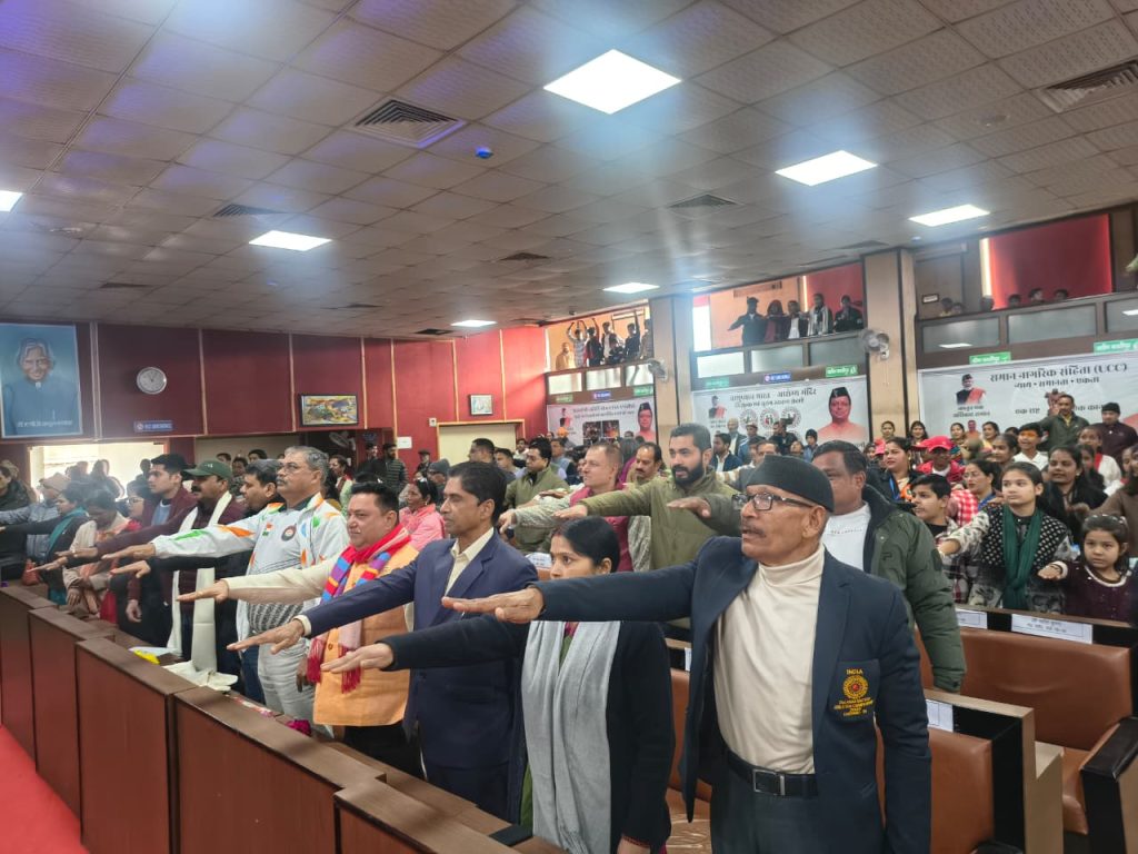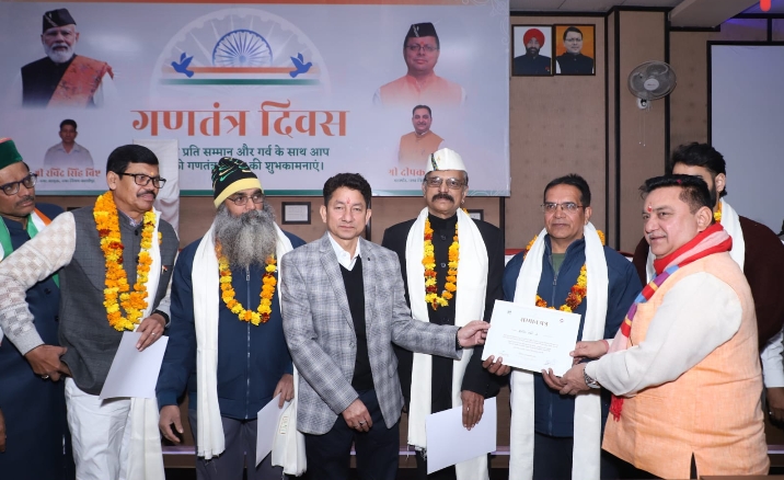 गणतंत्र दिवस के अवसर पर कारगिल युद्ध के शहीदों, स्वतंत्रता संग्राम सेनानियों के परिजनों तथा राज्य आंदोलनकारियों—नीरज गुप्ता, नरपत सिंह राजपूत, शोभित शर्मा एवं राजेंद्र सिंह के पुत्र को शाल ओढ़ाकर सम्मानित किया गया।