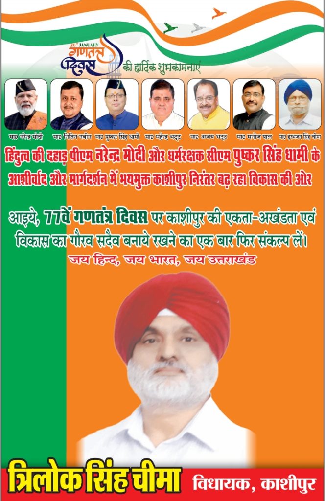 काशीपुर।राष्ट्रीय पर्व गणतंत्र दिवस नगर निगम काशीपुर प्रांगण में पूरे हर्षोल्लास, गरिमा और धूमधाम के साथ मनाया गया। इस अवसर पर महापौर दीपक बाली, विधायक त्रिलोक सिंह चीमा एवं मुख्य नगर आयुक्त रविंद्र सिंह बिष्ट द्वारा संयुक्त रूप से ध्वजारोहण किया गया।
