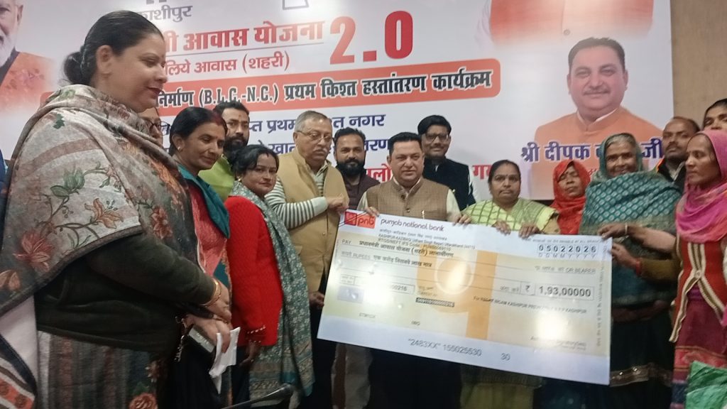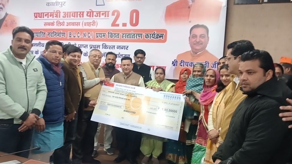 काशीपुर। प्रधानमंत्री आवास योजना 2.0 के अंतर्गत नगर निगम काशीपुर के 193 लाभार्थियों के खातों में माननीय मुख्यमंत्री पुष्कर सिंह धामी से प्राप्त प्रथम किश्त की धनराशि आज नगर निगम सभागार में आयोजित कार्यक्रम के दौरान हस्तांतरित की गई। इस अवसर पर पांच लाभार्थियों को सांकेतिक रूप से चेक भी प्रदान किए गए।