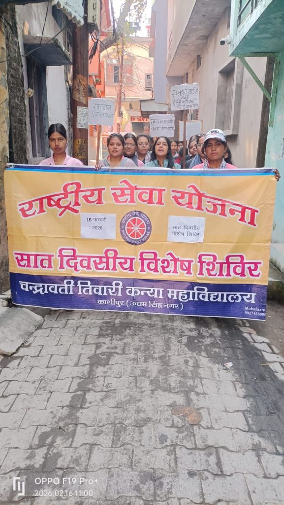 काशीपुर। राष्ट्रीय सेवा योजना (एनएसएस) के सात दिवसीय विशेष शिविर के चौथे दिन 16 फरवरी 2026 को शिविर स्थल कटरामालियान में स्वयंसेवियों द्वारा रक्तदान जागरूकता रैली निकालकर जनमानस को रक्तदान के लिए प्रेरित किया गया