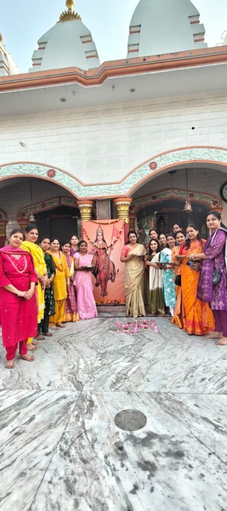 कार्यक्रम की शुरुआत मंदिर परिसर स्थित गौशाला में गौ सेवा से हुई, जहां उपस्थित महिलाओं ने गायों को चारा खिलाकर सेवा कार्य किया। इसके उपरांत सेविकाओं ने सामूहिक रूप से दुर्गा चालीसा का पाठ किया और भजन-कीर्तन के माध्यम से वातावरण को भक्तिमय बना दिया।