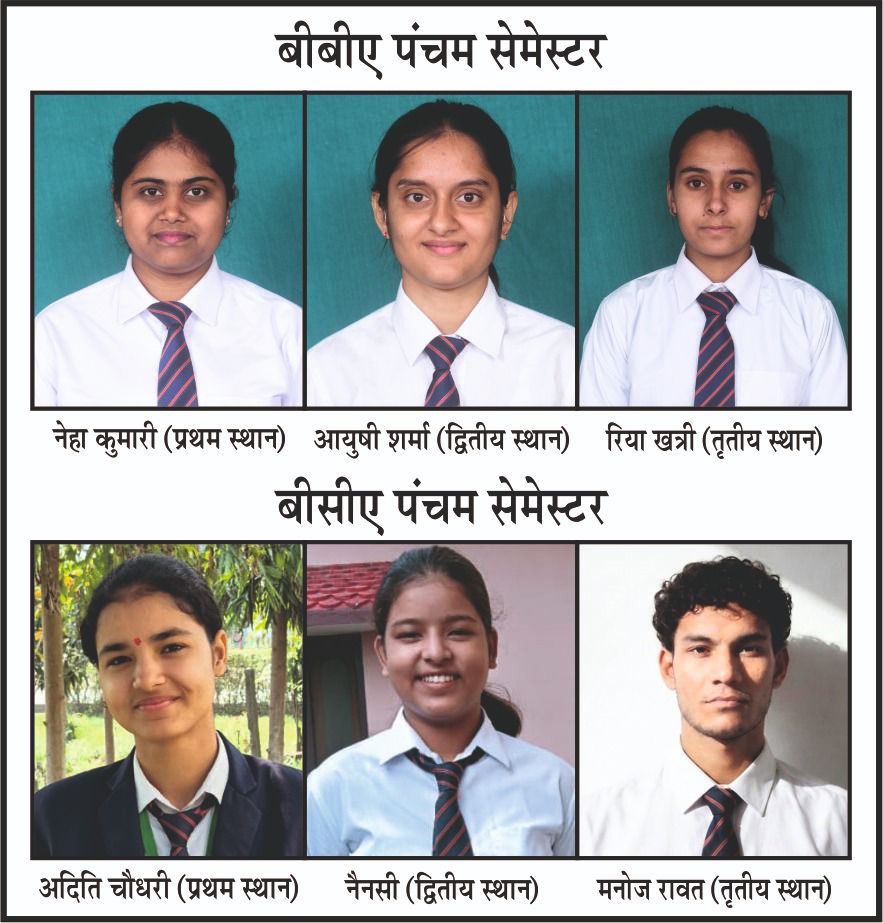 संस्थान की प्राचार्य डॉ. निमिषा अग्रवाल ने जानकारी देते हुए बताया कि बीसीए पाठ्यक्रम में अदिति चौधरी ने 76.6 प्रतिशत अंक प्राप्त कर प्रथम स्थान हासिल किया। नैंसी ने 74.8 प्रतिशत अंकों के साथ द्वितीय तथा मनोज चौधरी ने 74 प्रतिशत अंक प्राप्त कर तृतीय स्थान प्राप्त किया।