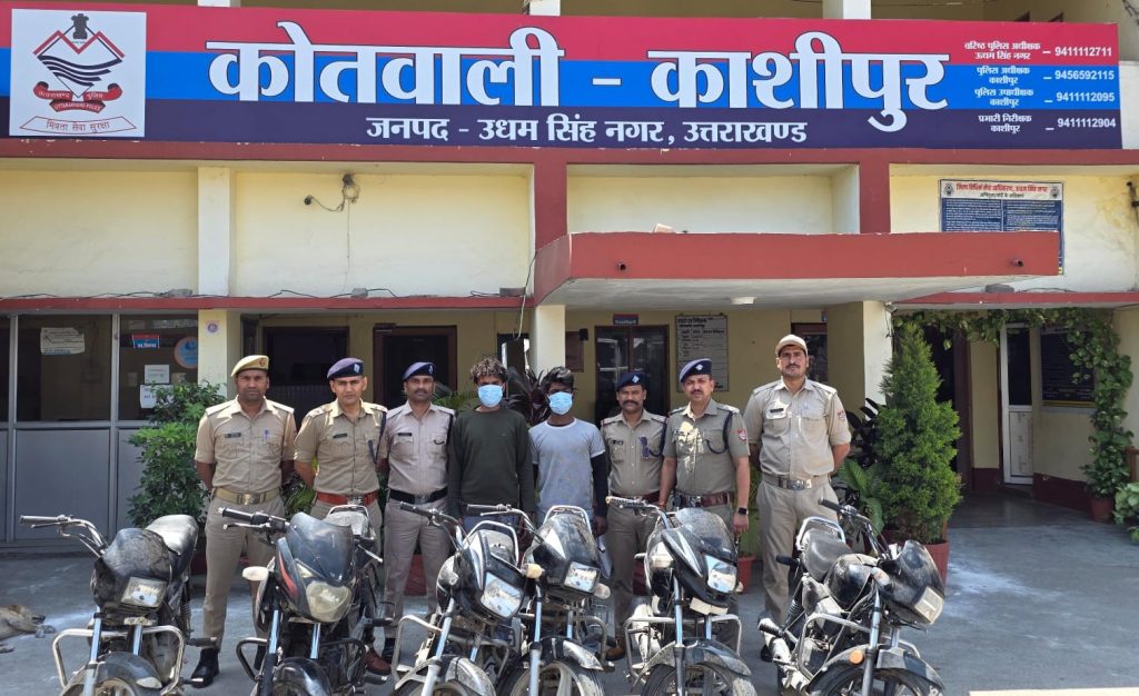 काशीपुर। कोतवाली काशीपुर पुलिस ने मोटरसाइकिल चोरी की घटनाओं का खुलासा करते हुए दो शातिर चोरों को गिरफ्तार कर उनके कब्जे से 6 चोरी की मोटरसाइकिलें बरामद की हैं।